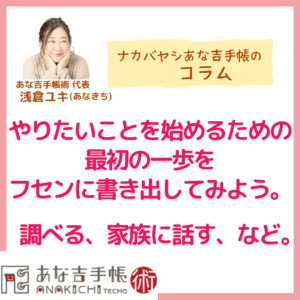 やりたいことを始めるための、最初の一歩をフセンに書き出してみよう。調べる、家族に話す、など。