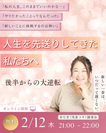 なんとなんと! 2月12日(木)21時~22時 あな吉さん、こと浅倉ユキさんの 無料オンライン講演会が決定しました\(^o^)/ ■お申込みはこちら https://anakichi.com/ … 続きを読む 人生を先送りしてきた私たちへ送る講演会